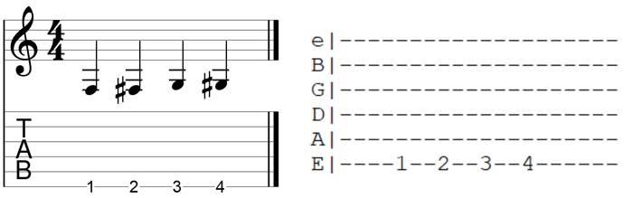 In the below Guitar TAB, you start by playing the 1st fret note, then play the 2nd fret note, then the 3rd fret note, and finally the 4th fret note because they are all written one after the other.