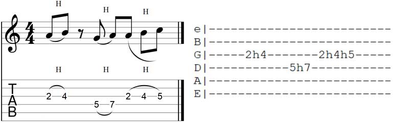 In text-based Guitar TAB this is shown as ‘h’ in between two notes. In formal Guitar TAB, this is shown as a curved line over the two notes as shown below and an H above the staff: