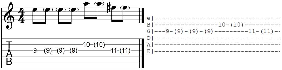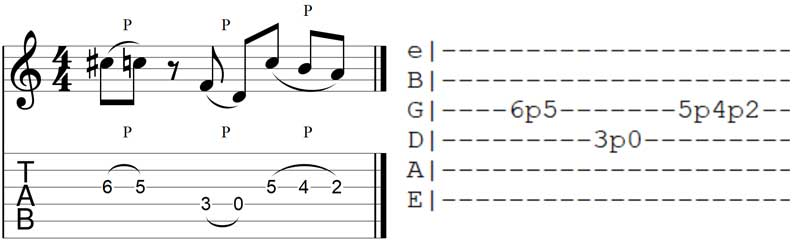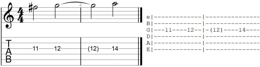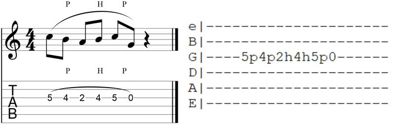 The curved line over all of the notes in formal Guitar TAB reminds us that all of this is played without picking (legato).