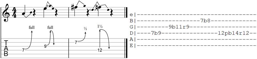 ‘1/2’ means a half-step bend, ‘full’ means a whole-step bend, ‘1 1/2’ means a one-and-a-half step bend and so on.