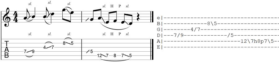 The same symbols are used in text-based and formal Guitar TAB so it’s easy to identify slides. Some old text-based Guitar TAB may show s instead of a slash (eg: 7s5).
