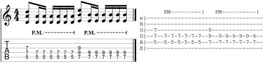‘PM‘ in Guitar TAB is the symbol for palm muting. This is usually displayed above or below the staff and is followed by a dashed line if the palm muting is held for a long time.