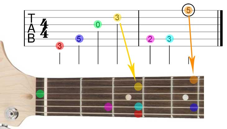 Take a look at the below diagram for examples of different Guitar TAB numbers and how each number matches a note on the guitar: